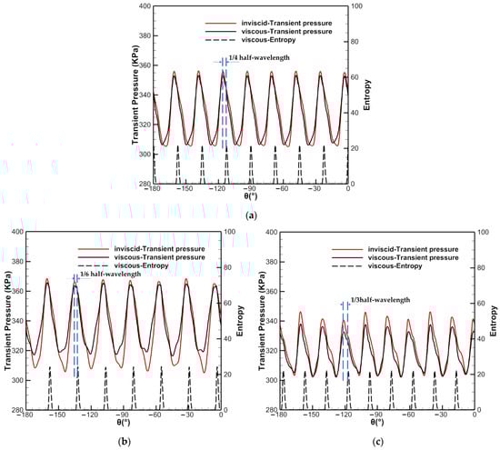 In the calculations with the viscous vane row, there was a second pressure peak (corresponding to the wake; explained in Figure 15 for the transient pressure curve) in all cases. As shown in Figure 16a, when the ratio of the number of vanes and rotor blades was 16:48, with a pitch size corresponding to Case0_Baseline, the second pressure peak (black solid line) corresponding to the vane wake (high entropy region in black dashed line) was located about a 1/4 half-wavelength to the right of the first pressure peak corresponding to the potential field (red line). The average amplitude of the transient pressure increased slightly, while the peak-to-peak amplitude decreased, compared to the results of the calculations with the inviscid vane row. When the vane pitch increased (pitch size corresponding to segment 2 of Case1_Asy97), as shown in Figure 16b, the distance between the second pressure peak and the first decreased, located about a 1/6 half-wavelength to the right of the first pressure peak. The average amplitude of the transient pressure increased significantly, while the peak-to-peak amplitude decreased. However, when the vane pitch decreased (pitch size corresponding to segment 1 of Case1_Asy97), as shown in Figure 16c, the distance between the second pressure peak and the first increased, located about a 1/3 half-wavelength to the right of the first pressure peak. The average and peak-to-peak amplitude of the transient pressure decreased. This distance is the relative circumferential position of the vane wake and the potential field at an axial position, which means that the average and peak-to-peak amplitudes of the transient pressure at the vane exit were affected by the joint effect of the vane wake and the potential field.