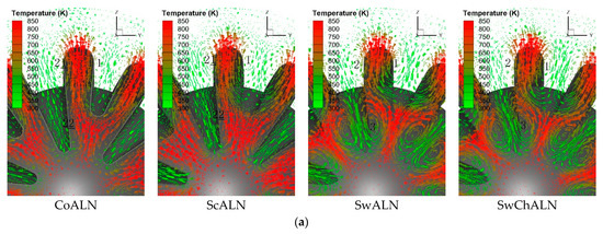 Unlike in ScALN, mixing in SwALN not only occurs earlier in the region off the sidewalls of the shallow valleys than in CoALN, but also in the region off the sidewalls of the deep valleys. Moreover, a pair of large and intensive longitudinal vortices is formed when the hot stream flows over each sword deep valley (the longitudinal vortices off the sword deep valleys), thereby causing the hot stream in the region between the deep and shallow valleys to turn toward both sides. This deflection of the hot stream causes the longitudinal vortices off the sidewalls of the shallow valleys to have a larger circumferential scale, with the radial scale being made smaller through an intensification of the radial flow of the hot stream in the region between the deep and shallow valleys caused by longitudinal vortices off the sword deep valleys. In addition, the circumferential and radial scales of the longitudinal vortices off the sidewalls of the deep valleys are approximately equal to those of the CoALN and ScALN bodies, respectively. Therefore, the longitudinal vortices off the sidewalls in SwALN are plumper. In SwChALN, chevron spoilers extending from the narrow valleys augment the penetration depth of the shallow valleys, and as a result, the longitudinal vortices off the sidewalls of the shallow valleys are even slimmer than those in ScALN; that is, the radial scale is increased and the circumferential scale decreased. The radial and circumferential scales are also slightly increased for the longitudinal vortices off the sidewalls of the deep valleys but decreased for the longitudinal vortices off the sword deep valleys.