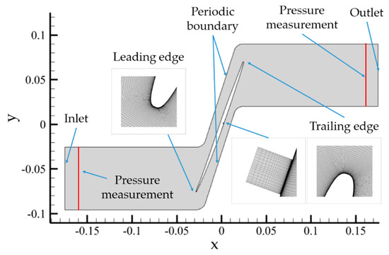 The computational domain contained a single blade with the inlet boundary at 1 time the chord length in front of the cascade and the outlet boundary at 1 time the chord length behind the cascade. The first mesh height of the blade surface was set to 1 × 10−6 m to ensure that the values of y+ near blade surface were less than 1. Due to the complex shock wave structure near the leading and trailing edges of the blade and the dramatic changes in the flow field parameters, the grid needed to be encrypted. The computational domain and grid are shown in Figure 1. The inlet boundary of the computational domain was the pressure far-field boundary and the outlet boundary was the pressure outlet. The blade wall was an adiabatic non-slip wall surface. The upper and lower boundaries of the domain were set as translational periodic boundaries. The inlet boundary condition was given the same total temperature and pressure as the experimental measurements [31]. The total pressure was given as 380 kPa, the total temperature was given as 320 K, and the incoming Mach number was 1.75, while the inflow angle was set at 70.5°. The pressure inlet was used to simulate the effect of a micro jet. The width of jet slot was 1 mm.