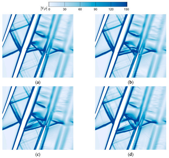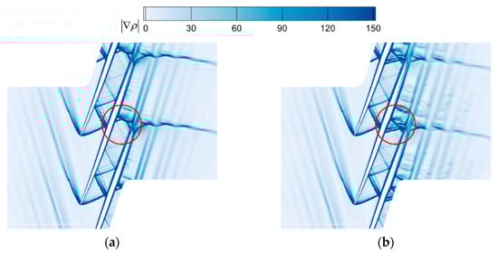 Thus, it can be found that as the air jet was arranged farther away from the trailing-edge shock, the airflow had sufficient distance to re-accelerate after the jet shock. The airflow downstream from the air jet reattached to the blade wall and generated an expansion wave. The farther the air jet from the trailing-edge shock, the stronger the expansion wave. Figure 13 shows that the longer distance and the stronger expansion wave fully promoted the airflow decelerated by the jet shock accelerating again. This was the reason why the downstream front feet reappeared when was 8 and even the same Mach reflection structure as the baseline case reappeared when was 10. The reappearance of shock and Mach stem was to decelerate the airflow in the blade passage. It can be seen that when the distance between the air jet and the trailing-edge shock was great, the air jet could not play the role of slowing down and pressurizing the airflow. As a result, it was impossible to achieve the purpose of weakening the strength of trailing-edge shock.