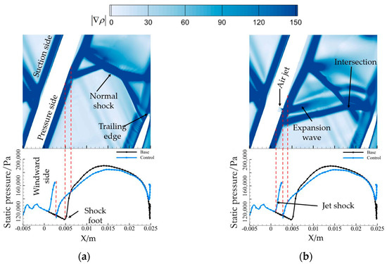 where is the density. The leading-edge shock of the cascade interfered with the blade below, and a reflected shock was formed. Multiple reflected shocks in the passage of the baseline cascade achieved the function of deceleration and pressurization of the incoming airflow. When the blade was under high back-pressure, a strong normal shock was generated at the trailing edge. The normal shock disappeared after the application of the air jet. Figure 5 shows the local enlargement near the trailing-edge shock and the corresponding static pressure distribution on the pressure side of the blade surface. The coordinate system used in Figure 5 is the same coordinate system of the calculation domain. The black curve and the blue curve indicate the baseline and the controlled cases, respectively. The jet slot is highlighted in red. Figure 5a shows that the structure of the normal shock was more complex compared to the usual shock in the inflow field. The normal shock developed into two shocks near the trailing edge of the blade and pressure side of the upper blade, respectively. Matsuo defined this structure as a bifurcated shock wave [32]. This structure can also be understood as two shock waves intersecting to form a Mach stem. This implies that the reflected shock in the passage was insufficient to pressurize the airflow and a Mach stem was needed to match the extremely high pressure downstream.