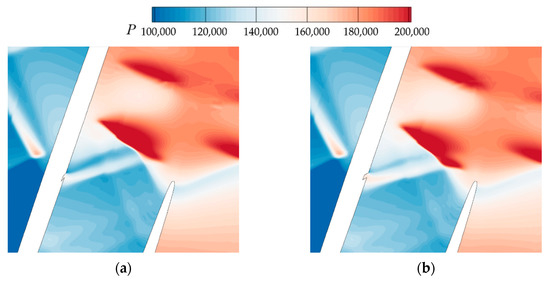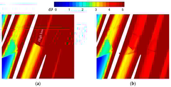 where are the total pressure of inlet, outlet and air jet, the static pressure of inlet and air jet, respectively; are the mass flow rates of inlet and air jet, respectively. From the contours of total pressure loss coefficients in Figure 6, the loss in the blade passage was effectively suppressed with the application of the air jet. The Mach stem resulted in high loss. As the trailing-edge shock turned into an oblique shock, the shock loss fell effectively due to the weakening of the shock strength.