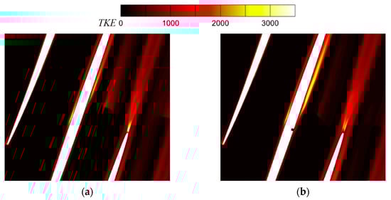 The obstructive effect of the air jet had an influence on the flow field near the blade wall. Combined with the static pressure distribution curves, there was a local inverse pressure gradient on the windward side of the air jet induced by the obstructive effect. As can be seen from Figure 7, the air jet caused an increase in turbulent kinetic energy level near the wall leading to an increase in local loss. Due to the limited proportion of the boundary layer relative to the throughflow area in the entire blade passage, it can be assumed that the local loss was low. In addition, after the air jet was applied, the turbulence kinetic energy level near the trailing edge decreased. The air jet was therefore beneficial to the overall performance of the cascade.