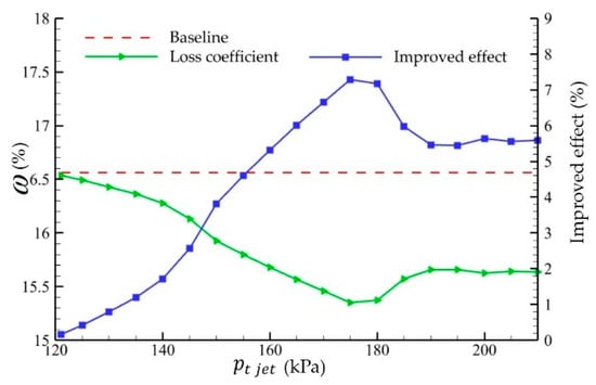 Profiles of variations of total pressure loss coefficient and improved effect with different strengths of jet.