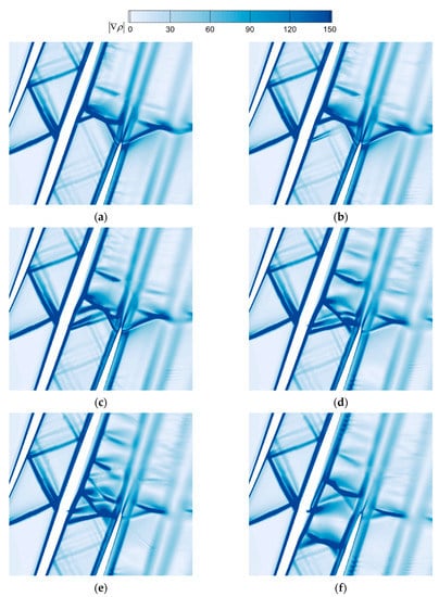 The shock structure in the flow field of the cascade for typical operating conditions is given in Figure 9. As the jet strength increased, the strength of the jet shock increased. The weak jet shock could not penetrate the entire blade passage, so it could not decelerate and pressurize the airflow anywhere in the entire passage. Thus, its effect on the downstream normal shock wave was very limited. As shown in Figure 9c, the jet shock gradually penetrated the flow field as the jet further strengthened. In this condition, the pressurization effect of the jet shock on the airflow was enhanced and the expansion wave downstream of the jet slot interfered with the trailing-edge shock leading to a shortening of the length of the Mach stem. When the jet shock was strong enough to penetrate the entire passage, it intersected the trailing-edge shock in Figure 9d. In this condition, it can be noticed that the bifurcated shock structure disappeared and evolved into two oblique shocks after coupling with the jet shock. Then, as shown in Figure 9a,e, Mach stem structure was formed at the trailing edge of the blade below, and multiple weak shock structures were formed downstream. As shown in Figure 9f, excessive jet strength caused the jet shock to move further forward and to no longer couple with the trailing-edge shock. Moreover, the jet shock structure was -shaped and was no longer an oblique shock. Meanwhile, the strength of the trailing-edge shock increased. Even though the structural changes in the jet shock and the trailing-edge shock had a more significant deceleration and pressurization effect on the flow field, the loss induced by shocks was further increased compared to the previous cases. It can be seen that a reasonable configuration of the strength of the jet shock and the trailing-edge shock is the key to improving cascade performance, so that the airflow is pressurized more gently.