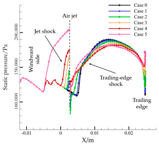 Combined with the contours of static pressure distribution in Figure 11, it was found that the changes in static pressure before and after the trailing-edge shock were moderated with control of the air jet, thus reducing the loss of mainstream flow. As the strength of the jet shock increased, the difference in static pressure before and after the jet shock was large, which was the reason for the weakening of the control effect after the jet strength exceeded the threshold.