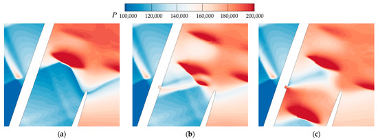 Static pressure contours with different strengths of jet: (a) baseline; (b) ; (c) .