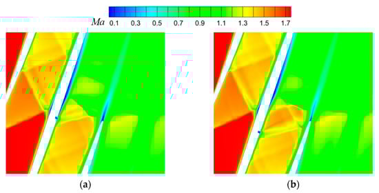 The jet shock had a deceleration and pressurization effect on the airflow upstream of the trailing-edge shock, so the strength of the trailing-edge shock was reduced. As can be seen from the static pressure distributions on the pressure side in Figure 5, wall pressure on the windward side of the air jet increased. The static pressure distributions also shows that the static pressure rise on the wall was more moderate and the peak static pressure dropped. It implies that the inverse pressure gradient in the passage near the trailing-edge shock was weakened by the application of the air jet. Comparing the ends of the two curves in Figure 5, the reverse pressure gradient at the trailing edge of the blade was also moderated. As can be seen, the scope of impact of the air jet was enormous and continued up to the trailing edge of the blade. The flow field was supersonic upstream of the trailing-edge shock. Thus, the air jet did not change the structure of the leading-edge shock and the reflected shocks.