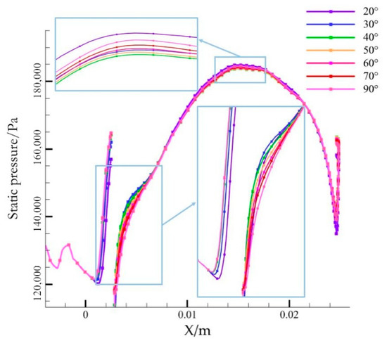 At the design incoming-flow condition with a back-pressure ratio of 2.5, the total pressure and location of air jet were maintained as constants at and , respectively. To investigate the influence of the jet angle, Table 4 presents the relative variations of the total pressure loss coefficient with different jet angles varying from 20° to 90° by 10° per condition (the 80° condition is ignored here as it is similar to the 90° result). Figure 14 shows the static pressure distribution at the pressure side for each condition. It was found that the effect of the jet angle on the loss control effect was relatively limited. Meanwhile, the wall static pressure distributions under all conditions were similar. It is probably due to that the momentum flux ratio J was small and the penetration of the jet into the flow field was weak, only lifting the fluid near the wall and thus deflecting the fluid in the passage, so changes in the jet angle could not significantly affect the mainstream flow field.