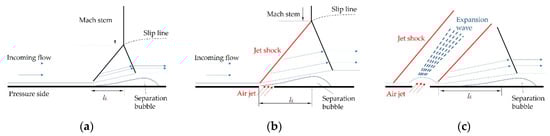 As ld increases, the length of the Mach stem decreases. Thus, the pattern of trailing-edge shock changes. As shown in Figure 16b, the air jet upstream of the trailing-edge shock increases the thickness of the boundary layer on the blade surface. Therefore, the air jet increases ld. If the jet is too close to the trailing-edge shock, the increased ld is not enough to make Mach stem disappear. As shown in Figure 16c, the fluid will reattach to blade wall if the jet is far from the trailing-edge shock. If the distance between the jet shock and trailing-edge shock is large, the expansion wave causes the decelerated fluid to re-accelerate sufficiently. The deceleration effect of the jet shock is impaired.
