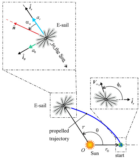 where is a dimensionless parameter that accounts for the possibility of switching either on () or off () the electron gun that maintains the E-sail electric voltage, and is the spacecraft characteristic acceleration, that is, the classical sail performance parameter defined as the maximum propulsive acceleration at a Sun–spacecraft distance equal to . The projection of the propulsive acceleration vector given by Equation (1) along the radial and circumferential directions yields