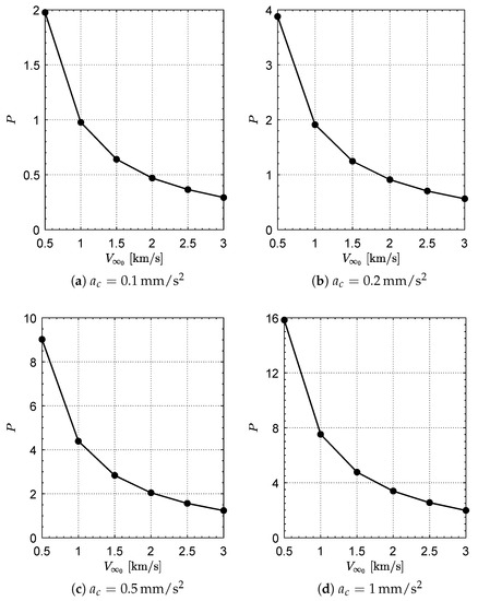 Figure 2 shows the values of P obtained after a flight time of as functions of the initial hyperbolic excess velocity and the E-sail characteristic acceleration . It is evident that, regardless of the E-sail performance level, the -EGA maneuver is more effective in increasing the hyperbolic excess velocity when its initial value is small. In those cases, indeed, the final values are several times larger than the initial values. However, the -EGA contribution is remarkable (on the order of some kilometers per second), even for large values of .