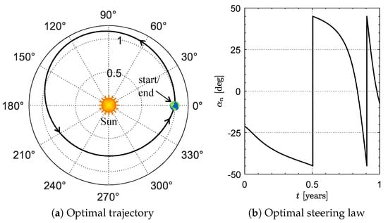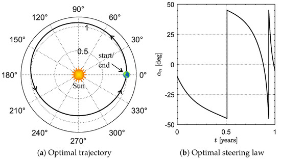 Having defined the optimal steering law through Equations (21) and (22), the spacecraft trajectory that maximizes the cost function J is obtained by solving the associated two-point boundary value problem (TPBVP). To this end, the dynamical Equations (4)–(7) and the Euler–Lagrange Equations (17)–(20) are numerically integrated in double precision using a variable-order Adams–Bashforth–Moulton solver scheme [45,46], with initial conditions given by Equations (8), (9) and (12), and terminal conditions expressed by Equations (14) and (15).