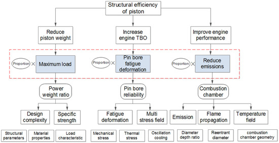 Analyzing the technical route of piston development, combined with the original definition of structural efficiency, and according to the use characteristics and development experience of the aviation kerosene piston engine, the piston should meet the fatigue resistance under lightweight conditions, the piston pin bore will not deform during the durability test, and the piston design should improve the engine combustion efficiency and reduce emissions. According to the above design requirements, the multi-dimensional objectives of structural efficiency of the aviation kerosene engine piston are put forward, that is, the maximum load of the piston under thermal–mechanical coupling, the deformation of piston pin bore, and the emission performance index caused by the piston’s top combustion chamber. The mathematical relationship between each target and piston structure is studied, the mathematical model of the piston structural efficiency is established, and the benefit between structural change and a multi-dimensional target is quantitatively evaluated, as shown in Figure 1. According to the technical obstacles of various objectives in development, each item was given the appropriate proportion.
