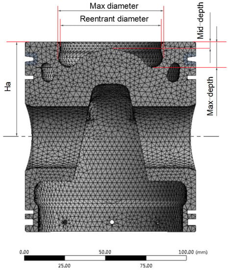 According to the analysis of the connotation of piston structural efficiency, three important components of the connotation were determined. The three connotations were calculated and analyzed and the numerical value was obtained. By comprehensively analyzing the operating conditions of the engine, the multiple design iteration of the piston was carried out, and two ideal piston design schemes were completed. According to the above three connotations, the design scheme optimizes the parameters that affect the above connotations. It mainly lies in the change of the distance from the center line of the piston pin to the piston crown and the size of the combustion chamber. Ha represents the distance between the center line of the piston pin and the piston crown, which affects the weight and stiffness of the piston. The smaller the value of Ha, the closer the piston pin approaches the piston crown, the larger the bearing area of the piston pin, and the lower the probability of deformation of the piston pin bore. The piston crown’s thickness was reduced, the piston mass was reduced, and the specific mass of the engine was improved. However, the stiffness decreased, which affected the maximum bearing capacity of the piston, and the connecting rod needed to be lengthened. The larger the value of Ha, the greater the piston stiffness and the higher the bearing capacity of the piston. However, the piston weight increased, the specific mass of the engine decreased, the stroke decreased, and the working volume of the engine decreased. The size of the combustion chamber has a great influence on the combustion efficiency and emissions of the engine. The three dimensional model of piston was meshed, as shown in Figure 2. According to the design manual [32], the key dimensions of the two piston design schemes obtained through multiple iterations are shown in Table 2.