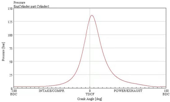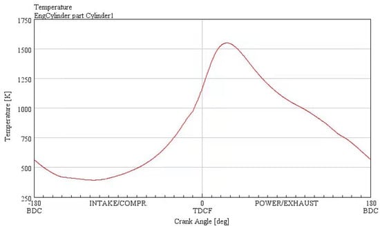 To calculate the bearing capacity of the piston, it is necessary to understand the boundary conditions of the piston. The combustion analyzer and the engine numerical model were used to obtain the explosion pressure curve and temperature field curve in the engine cylinder under adverse conditions, as shown in Figure 3 and Figure 4. The maximum explosion pressure in the cylinder was 139 bar, which appeared at 7 CA after the top dead center (TDC). The maximum temperature was 1590 K, which occurred at 20 CA after TDC, which was caused by the combustion characteristics of kerosene. The above two schemes were analyzed, applying the same temperature field and stress field, and the side stress of the primary and secondary thrust surfaces of the piston was considered, as well as the heat transfer coefficient and ambient temperature at different positions of the piston under the third kind of thermal boundary conditions. The analysis results are shown in Figure 5 and Figure 6.