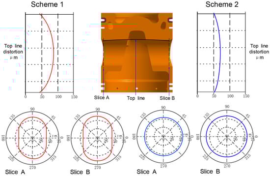 According to the design objective of the engine, after the test and simulation calculation, the cylinder pressure of each cylinder reached 138 bar when reaching the rated power. For the same thermal–mechanical coupling analysis of the piston under the two schemes, the deformation calculation results of the piston pin hole are shown in Figure 8. According to the data in Figure 8, the pin bore deformation of scheme 1 reached 85 μm, and the pin bore deformation of scheme 2 was about 60 μm. This is because the distance between the piston pin bore and the piston crown in scheme 1 was greater than that in scheme 2, the force area of the piston pin decreased, the specific pressure on the upper surface of the piston pin hole increased, and the deformation under the same conditions will also increase. With the increase of the deformation of the piston pin bore, the cross-sections at both ends of the piston pin bore were also deformed. In scheme 1, the two ends are elliptical, while in scheme 2, the two ends are circular. The shape of the cross-sections at both ends also affected the lubrication between the piston pin and the pin bore. When the cross-sections at both ends were elliptical, it indicated that the pin hole was deformed greatly at this time, and extrusion occurred between the pin bore and the pin at the elliptical short half-axis. The lubrication conditions were poor, which aggravated the wear between the piston and the piston pin and reduced the service life of the piston components. When the cross-sections at both ends were circular, it indicated that the deformation in the piston pin bore tended to be uniform at this time. Within a reasonable control range, the lubrication between the piston and the piston pin was good, and the service life of the piston components was improved.