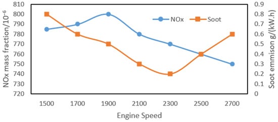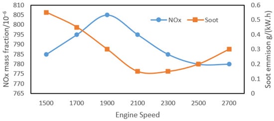 Emission is an inevitable problem of piston engines. The piston combustion chamber was studied under two schemes, mainly from the emissions generated by the combustion chamber, for comparative analysis. The engine uses aviation kerosene as fuel, and the main emissions are NOx and soot. The engine emissions under the two piston combustion chamber schemes are shown in Figure 9 and Figure 10.