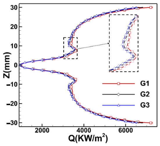 Figure 4 illustrates the distributions of blunt body wall heat flux for three types of grids standing at X = 120 mm. Grid G1 was abandoned due to the largest difference compared to other grids. Negligible discrepancies were observed in the numerical results calculated by grids G2 and G3, thus indicating that grid G2 has sufficient accuracy to assurance the mesh independency. Owing to the smaller number of meshes, the grid G2 was employed for the follow-up numerical simulations to economize the computing resources and time. In addition, considering the error accumulation, the ration coefficient Rs > 1.0 proposed by Smirnov et al. [40,41] was selected in the following cases.