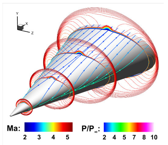 A deep insight into the flow characteristics around a typical HIFiRE-5 configuration is the basis for further study. The Mach number contours of cross section perpendicular to the flow direction can be seen in Figure 5. Owing to the profile of the cross section of HIFiRE-5 configuration being elliptical, the intensity of conical shock wave is nonuniformly distributed under the hypersonic incoming flow condition. Furthermore, the angle of the surface deflection is different, thereby rendering a stronger shock wave near the side edge (x–z plane) that is closer to the surface than the shock wave near the centerline (x–y plane). Consequently, the spanwise pressure gradient is generated, which results in the crossflow with the streamlines deflecting from the side edge to the centerline. Eventually, a mushroom-shaped longitudinal vortex is generated along the centerline. Generally, the inflected point of the velocity profile in the boundary layer is generated owing to the longitudinal vortex structure, which leads to the boundary layer transition. Hence, the first and second unstable disturbances dominate the boundary layer transition of HIFiRE-5 configuration near the centerline, whereas in the area between the side edge and centerline, the cross-mode disturbance has a leading role.