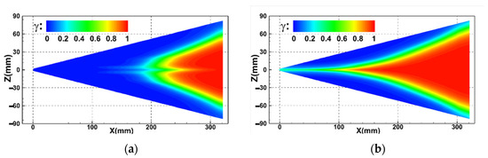 Comparison of γ distributions. (a) without aerodisk, (b) with 2 mm long aerodisk.