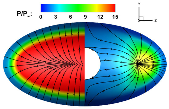 Concerning the γ distribution, the transition onset is discovered at the root of the aerodisk, and the transition develops rapidly along the centerline. Figure 7 delineates the streamlines and the non-dimensional pressure (P/P∞) contours near the aerodisk in the symmetry plane. Conspicuously, owing to the existence of aerodisk, the recirculation zone with low pressure is created around the aerodisk, and the reattachment shock leads to a reattachment point lying on the shoulder of the forebody. The comparison of surface P/P∞ and limiting surface streamlines on the nose are shown in Figure 8. Through quantitive analysis, the peak point of surface pressure is discovered a little downstream from the reattachment point. The peak pressure is reduced about 70.91% and is much lower compared to that without an aerodisk. Furthermore, as the reattachment shock generates the peak pressure point and its strength dominates the pressure drag, the peak surface pressure could reflect the drag reduction effects of aerodisk to a certain extent. Moreover, as delineated in Figure 9a, it is observed along the side edge that the surface pressure drops first in the recirculation region and then rises rapidly to the maximum point a little downstream from the reattachment point, which stimulates a large adverse pressure gradient before the shoulder of the forebody. Previous studies have shown that a positive pressure gradient can generally stabilize the flow, whereas the adverse pressure gradient disturbs the flow. Consequently, the separation-induced transition that happens in the separated shear layer at the rear half of the aerodisk can be facilitated.