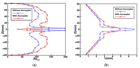 Furthermore, the transition shape becomes wider owing to the existence of the aerodisk. As already mentioned, the transition between the centerline and side edges is dominated by crossflow. Figure 10 shows the distribution of the cross-mode characteristic timescale (τcross) at the specific x-axis sections as X = 100, 170, 240, 310 mm, which is defined in Equation (15). It is evident that the τcross increases following the installation of the aerodisk, which widens the transition region (see Figure 6). For quantitative comparison, as the crossflow Reynolds number (ReCF) is defined in Equation (18) and designed as a feasible crossflow strength indicator, the distribution of ReCF along X = 300 mm is displayed in Figure 11a. By analyzing the construction of ReCF, although the maximum nondimensional crossflow velocity (|ω/Ue|max) decreases due to the lower spanwise pressure gradient after installing the aerodisk, the boundary layer thickness (δ) increases significantly in the area between the leading edge and the centerline, which is regarded as the reason of the increase of ReCF for the case with an aerodisk, and directly promotes the increase of τcross. Obviously, as seen in Figure 11b, owing to the non-axisymmetric nose, the aerodisk weakens the conical shock unequally, which thins δ on the centerline, while δ aside the centerline obtains the capacity to remain thicker correspondingly. It is also noticed in Figure 11a that ReCF shows a rapid increase near the centerline. As noticed before, the longitudinal vortex is generated near the centerline. Therefore, the rapid increasement of δ owing to the existence of longitudinal vortex (see Figure 11b) leads to the excessively large ReCF. Moreover, as the crossflow velocity decreases near the centerline, ReCF is decreased again close to the centerline. In addition, as δ would grow thicker with the flow along the wall, the aerodisk provides the extra length, which gives rise to a thicker δ of the HIFiRE-5 afterbody with an aerodisk compared to that without an aerodisk in the same place and increases ReCF correspondingly.