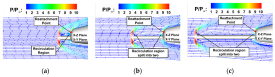 Comparison of P/P∞ in the leading edge. (a) L = 2 mm, (b) L = 6 mm, (c) L = 12 mm.