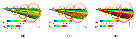 Characteristics of flow field of HIFiRE-5 under different α. (a) α = 2°, (b) α = 4°, (c) α = 6°.