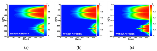 Distributions of γ without aerodisk at α = 2°,4°,6°. (a) α = 2°, (b) α = 4°, (c) α = 6°.