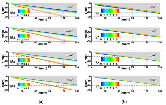 Distribution of Ma and χ contour without an aerodisk on the symmetry plane at different α. (a) Ma contour, (b) χ contour.