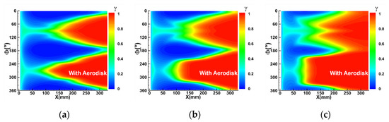 Distributions of γ with aerodisks at α = 2°,4°,6°. (a) α = 2°, (b) α = 4°, (c) α = 6°.