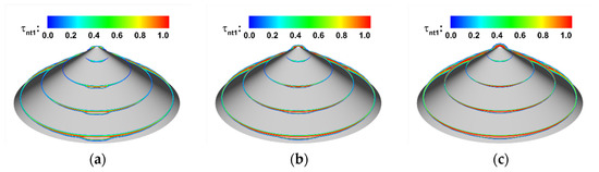 As for the windward side (180° < Φ < 360°), Figure 20 shows the distribution of the first unstable disturbance timescale (τnt1) on the windward surface. According to the previous analysis, the maximum crossflow velocity would be declined owing to the decayed spanwise pressure gradient. Furthermore, the increase of α prevents the windward boundary layer from becoming thicker. Consequently, with small |ω/Ue|max and δ, the cross-mode unstable disturbance is not strong enough to trigger the boundary layer transition with α, and the transition is dominated by the longitudinal vortex which could be expressed by the first and second unstable disturbances as the aforementioned reason. The rapid attenuation of the entropy layer on the windward side promotes the development of the first unstable disturbance, and the region with a large timescale of the first unstable disturbance is dilated. Consequently, the transition shape is relevantly broadened, and the transition onset in the area between centerline and side edge moves upstream with the increasing α. Furthermore, the more body-fitted shock results in the higher density and Mach number of boundary layer edge, which leads to a larger Reynolds number and hence brings about a trend of earlier boundary layer transition.
