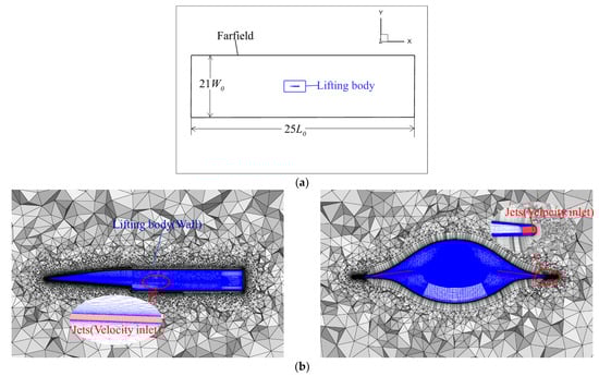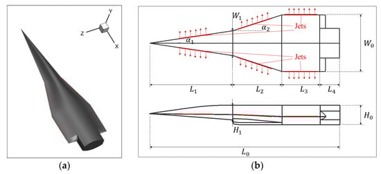 As shown in Figure 1, the baseline geometry, with a length of , a width of and a height of , is a hypersonic aircraft. It is a typical waverider equipped with a lifting body, which can be divided into three main parts, with a length of , and , respectively. Additionally, is the length of the aircraft tail, designed for controlling the aircraft. The other geometric parameters are shown in the figure as well. For convenience, the horizontal tail was ignored, and the air inlet and the engine nozzle were blocked. It is believed that the above simplifications are reasonable due to the fact that only relative lift changes are important in this context. All cases were conducted at a freestream Mach number of 0.3 with the angles of attack ranging from 0° to 20°, resulting in a Reynolds number of . The jet slots were arranged along the side edges of the lifting body. Each jet slot had a length of 0.2 in the x direction and a width of 0.088 in the y direction, with a blowing direction parallel to the z-axis.