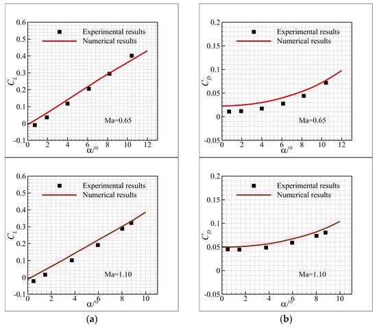 Comparison of the experimental and numerical results at Ma = 0.65, 1.1 and Re = . (a) Lift coefficient; (b) Drag coefficient.