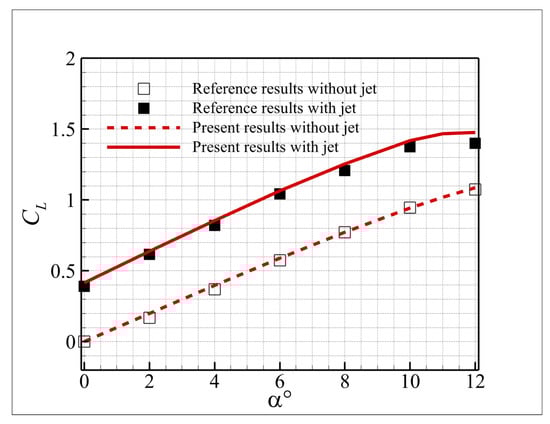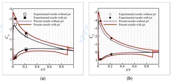 To validate the accuracy of the jet modelling, an experiment carried out by Boeije et al. [37] was reproduced by numerical simulations in this section. Their experimental model had a NACA0018 airfoil profile, a chord of 0.165 m and a jet width of 0.001 m, located at the 90% chord line on the lower surface. The freestream velocity, , was 58 m/s, the Reynolds number was and the momentum coefficient, , was 0.012. In their experiment, two pressure ports were used to measure the pressure coefficient distributions along the upper and lower surfaces, respectively. Additionally, they had evaluated the changes in the lift with and without the microjets, while the lift coefficients were obtained numerically in the same condition as that in the experiment by using a software package, ANSYS CFX 11.0. As shown in Figure 5, the pressure coefficient distributions by numerical simulations agree well with the experimental data at both angles of attack. Figure 6 gives the comparison of the lift coefficients between the present and reference results. The two data sets also show a good agreement. As a result, the accuracy of the current numerical method is sufficient for this study.