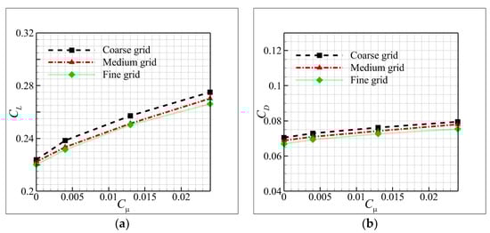 A grid convergence study was carried out to ensure a grid independence result. Three grids with different densities were generated for the study as shown in Table 2 and Figure 7. The finer grid was generated through refining the grid points along both the streamwise and spanwise directions, as well as increasing the number of surface grid cells near the jets. The average of the first cell normal to the body surface was kept below one for an appropriate near-wall turbulence modelling, as shown in Table 2. The simulations were conducted for four different jet momentum coefficients at a Mach number of 0.3 and an angle of attack of 10°. Figure 8 gives the comparison of the lift and drag coefficients between the three grids. It can be seen that the lateral blowing causes an increase in both the lift and drag coefficients. The results on different grids are very close to each other, and only minor differences can be noticed for the coarse grid. Thus, the following study will proceed with the medium grid by considering a trade-off between the numerical accuracy and the computational costs. By using a high-performance computer with a total of eight Intel E5-2620 v4 CPUs, the time cost of each run was about 8 h.
