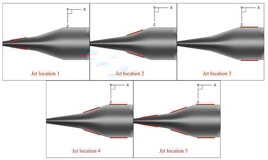 The effect of the jet location on lift augmentation was first studied by designing five jet configurations, as shown in Figure 9. The jet slots were arranged along the side edges of the front part, the middle part and the rear part of the lifting body, respectively, as well as their combinations. The corresponding jet regions in the x direction are (0.15 , 0.35), (0.45, 0.65) and (0.7, 0.9), respectively. Each slot has a length of 0.2 in the x direction and a width of 0.088 in the y direction. All cases were chosen with the same jet momentum coefficient, , of 0.013 and the same jet direction; parallel to the z-axis.