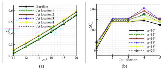 Changes in lift by the lateral jets at different jet locations. (a) Lift coefficient; (b) Lift coefficient augmentation.