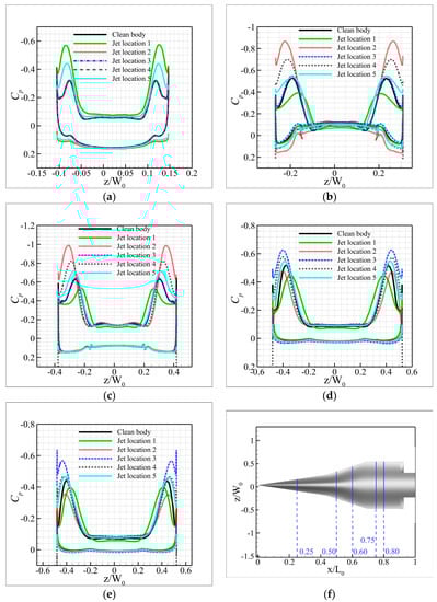 Comparison of the pressure coefficient distributions at the chosen cross-sections for different jet locations at . (a) 0.25; (b) 0.5; (c) 0.6; (d) 0.75; (e) 0.8; (f) Illustration of the cross-sections.