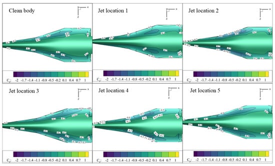 Comparison of the pressure coefficient contours on the upper surfaces for different jet locations at .