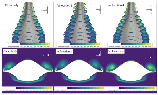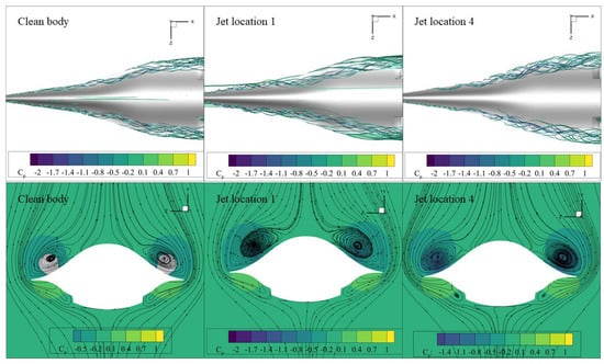 The lift rise achieved by the lateral jets can be associated with the leading-edge vortices, as shown in Figure 13 and Figure 14. For each configuration, two counter-rotating vortex pairs can be clearly observed, inducing a low pressure on the upper surface of the lifting body. Due to a well-designed lateral blowing, such as that of the “Jet location 4” configuration, the strength of the leading-edge vortices has been reinforced, resulting in an increase in the vortex lift. However, blowing on the front part of the lifting body, such as that in the “Jet location 1” configuration, is similar to the effect of a canard wing, causing an unfavorable interference downstream. For this unfavorable blowing, the leading-edge vortices shedding from the front part of the body merge with the downstream vortices, causing them to move upwards. As a result, the suction peaks on the middle and rear parts of the body decrease and so does the overall lift.