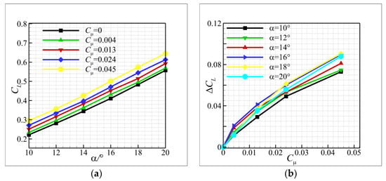 Changes in lift by the lateral jets with different jet momentum coefficients. (a) Lift coefficient; (b) Lift coefficient augmentation.