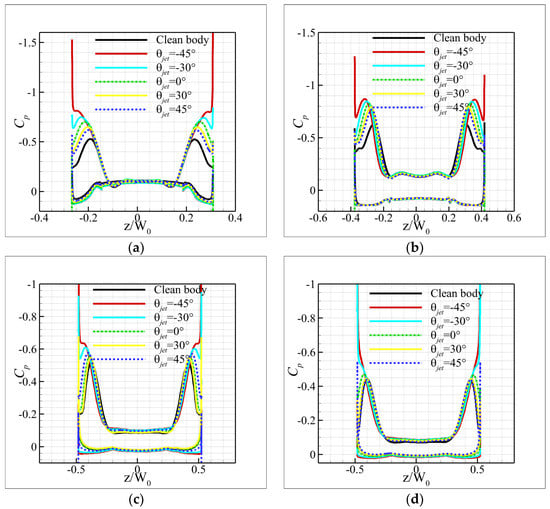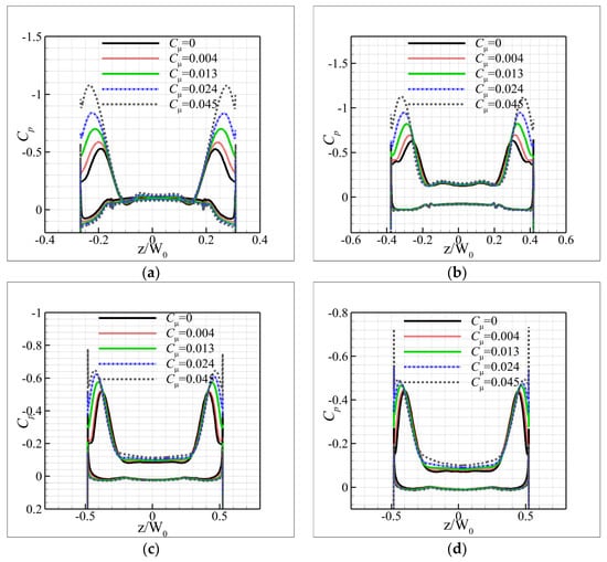 Comparison of the pressure coefficient distributions at the chosen cross-sections by the lateral jets with different jet momentum coefficients at . (a) 0.5; (b) 0.6; (c) 0.75; (d) 0.8.