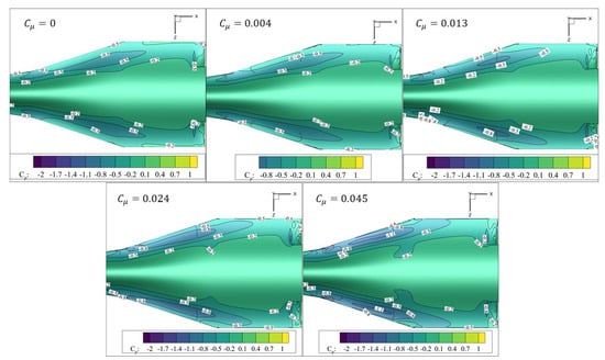 Comparison of the pressure coefficient contours on the upper surfaces for different jet momentum coefficients at .