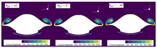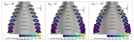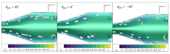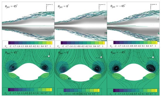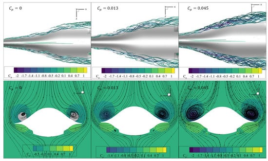 Figure 21 presents the lift changes for different blowing directions. It can be observed that a high lift rise is obtained when = 45° or 30°, whereas the lift augmentation decreases when = 30° or = 45°. It indicates that blowing towards the lower surface has a better control effect than blowing towards the upper surface. The pressure coefficient distributions and the pressure coefficient contours shown in Figure 22 and Figure 23, respectively, confirm the same observation. The suction peak in the case of = 45° is higher than that of = 45°. In contrast to increasing the jet moment coefficient, changing the blowing direction causes minor changes in the strength of leading-edge vortices, as shown in Figure 24 and Figure 25. However, blowing towards the upper surface moves the leading-edge vortices slightly upwards, causing a decrease in generating the vortex lift. This is similar to the unfavorable interference caused by the leading vortices shedding from the front part of the body, as discussed in the case of the “Jet location 1” configuration.