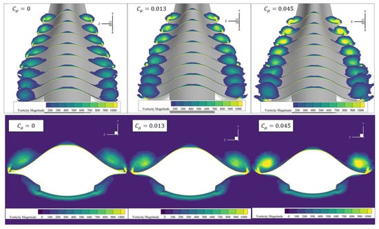 Figure 15 shows the changes in lift coefficient for different jet momentum coefficients, ranging from 0 to 0.045. As expected, it can be seen that the lift increases as the jet momentum coefficient increases. In addition, the changes in lift are relatively insensitive to the angle of attack. When , the peak relative change in lift coefficient is close to 0.09. By examining the pressure coefficient distributions and the pressure coefficient contours shown in Figure 16 and Figure 17, respectively, it is clear that both the suction peak and the size of low-pressure area increase as the blowing strength increases, resulting in an increase in the overall lift. The effectiveness of increasing the jet momentum coefficient can be explained by the same flow mechanism as mentioned in the previous section. As shown in Figure 18 and Figure 19, a stronger blowing induces stronger leading-edge vortices, resulting in a higher vortex lift.