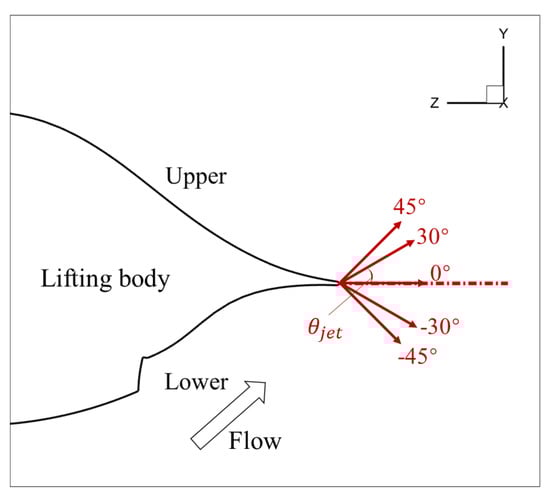 In addition to the jet location and the blowing strength, the blowing direction is another key parameter for the control effectiveness of the lateral jets. As shown in Figure 20, the jet direction, , is defined as the angle between the blowing direction and the z-axis. A positive value means pointing towards the upper surface of the lifting body, and a negative value means pointing towards the lower surface of the lifting body. Five jet configurations with the blowing directions of 45°, 30° and 0° were considered in this study. The baseline configuration was assumed to be = 0°. According to the previous studies, the jet momentum coefficient was chosen as 0.013 and four jet slots were placed on the middle and rear parts of the lifting body such as that in the “Jet location 4” configuration shown in Figure 9.