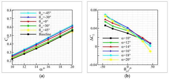 Changes in lift by the lateral jets with different blowing directions. (a) Lift coefficient; (b) Lift coefficient augmentation.