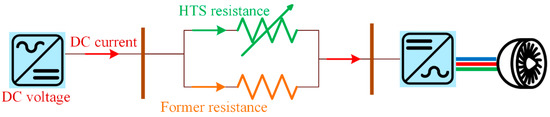 where is the current passing through superconducting tapes, is the current passing through the former layer, is the total current entering the DC HTS cable, is the temperature-dependent resistance of the former layer, and is the current-dependent resistance of superconducting tapes.